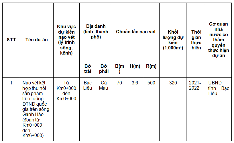 Danh mục Dự án nạo vét vùng nước đường thủy nội địa kết hợp thu hồi sản phẩm
